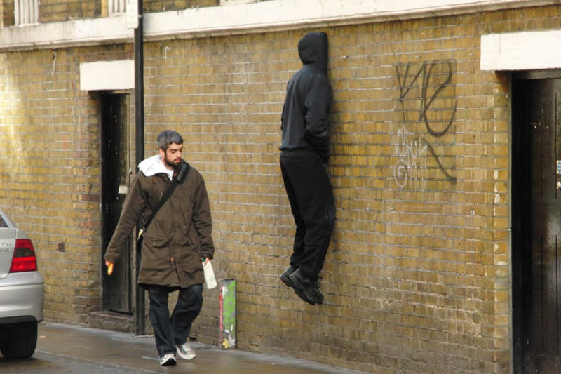 По данным CALM каждую неделю в Великобритании 84 человека совершают самоубийство, большая часть из которых мужчины. Марк Дженкинс наглядно подсветил проблему. Примечательно и то, что манекены изготовлены из слепков с тел друзей и родственников людей, совершивших самоубийство. Подобные интервенции вскрывают не только тему эмпатии, но и рефлексируют о безопасности среды.
