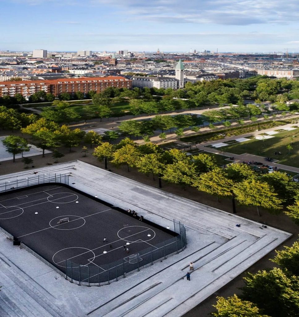 Один из показательных кейсов — Enghaveparken: парк одновременно работает как общественное пространство и как резервуар, который в экстремальный ливень может принять миллионы галлонов воды.