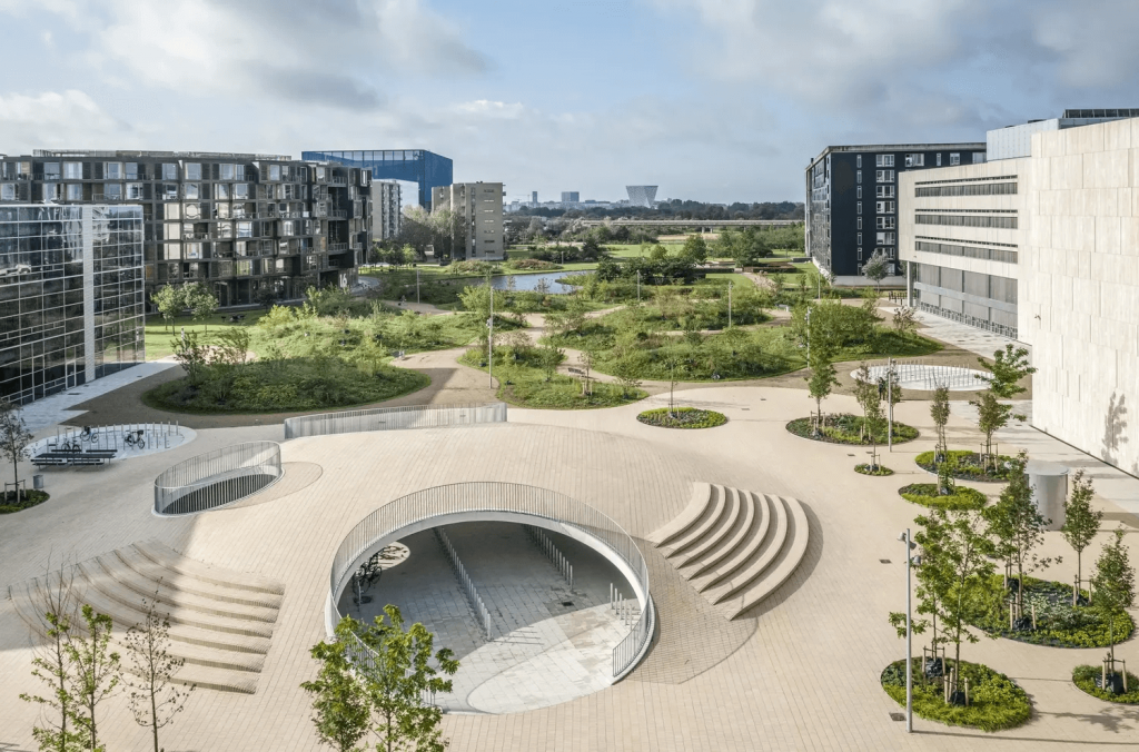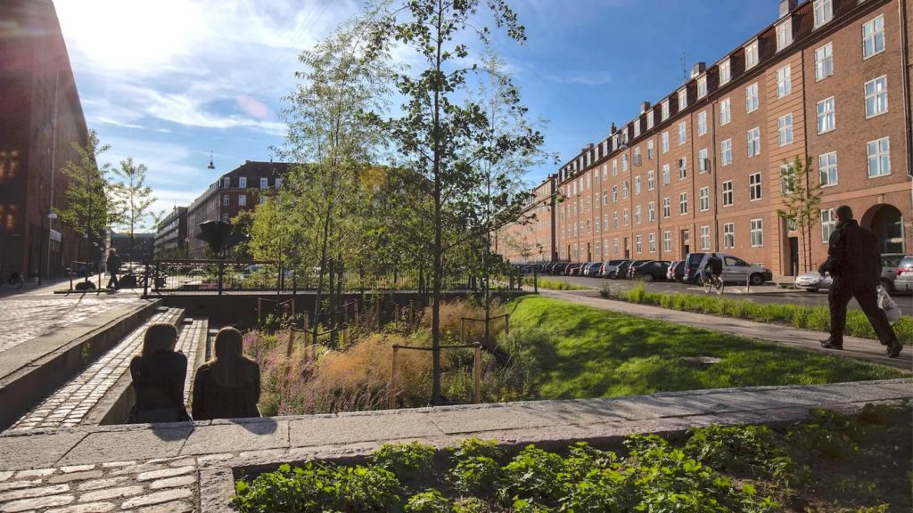 Другой пример — Karen Blixen Square: площадь-парк спроектирована так, чтобы в дождь собирать и распределять воду, а в сухую погоду оставаться активной городской сценой с маршрутами и ритмом движения.