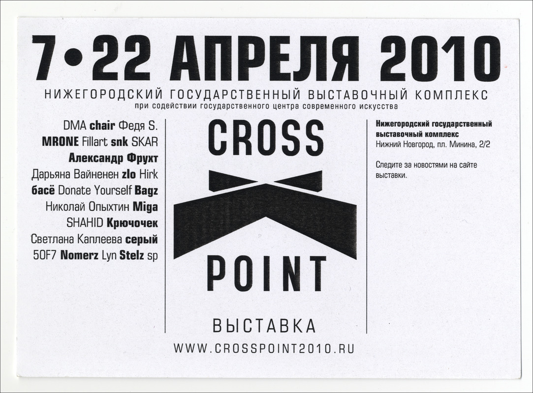 Самой знаковой в повествовании становится выставка Crosspoint, прошедшая в 2010-ом году и давшая мощный импульс к совместной работе художников и созданию коллективных работ. Экспозиция состояла из пяти сюжетов в виде комнат, пропуская через себя общий нарратив «об отношениях художников с пространством и временем, городом и мастерской, обществом и друг с другом». Каждый автор транслировал своё уникальное видение окружающего мира, предлагая зрителю порассуждать на темы жизни, смерти, информационной безопасности, памяти о прошлом.