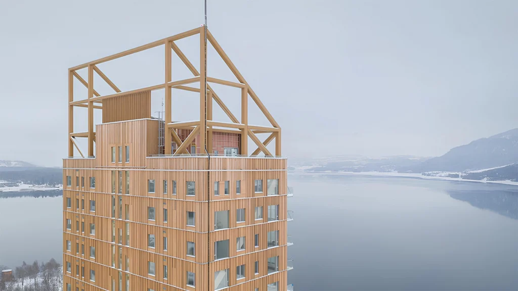 Мьесторнет, Норвегия — 18-этажный небоскреб из дерева. Проект наглядно доказывает, что дерево — это не только для малоэтажного строительства, но и для полноценных небоскребов, отвечающих всем требованиям прочности, комфорта и пожарной безопасности.