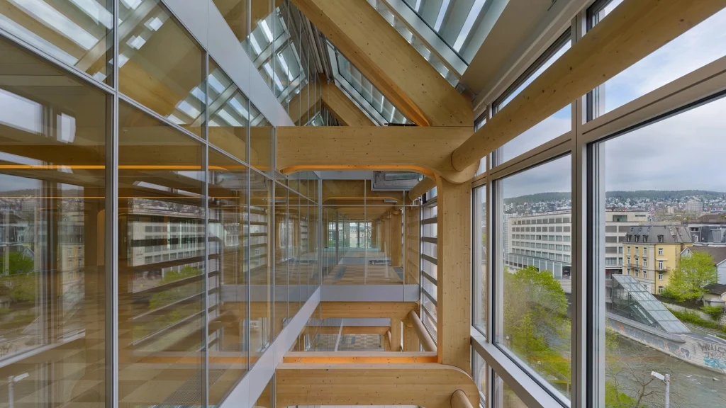 Офисное здание Tamedia, Швейцария — вершина плотницкого мастерства. Проект демонстрирует, что инновации могут идти рука об руку с многовековыми ремесленными традициями, создавая неповторимую и теплую атмосферу рабочего пространства.