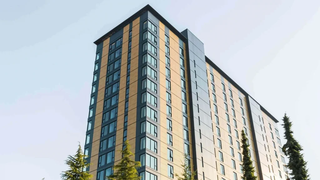 Брок Коммонс Таллвуд Хаус, Канада — скоростное строительство 18-ти этажного студенческого кампуса. Этот гибридный проект (есть бетонные балки) — наглядный урок эффективности. Он показывает, что массовое деревянное строительство значительно быстрее традиционного, что снижает затраты и шумовое воздействие на окружающую среду.