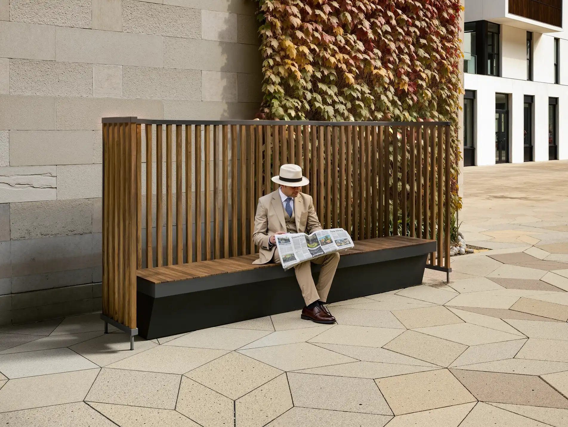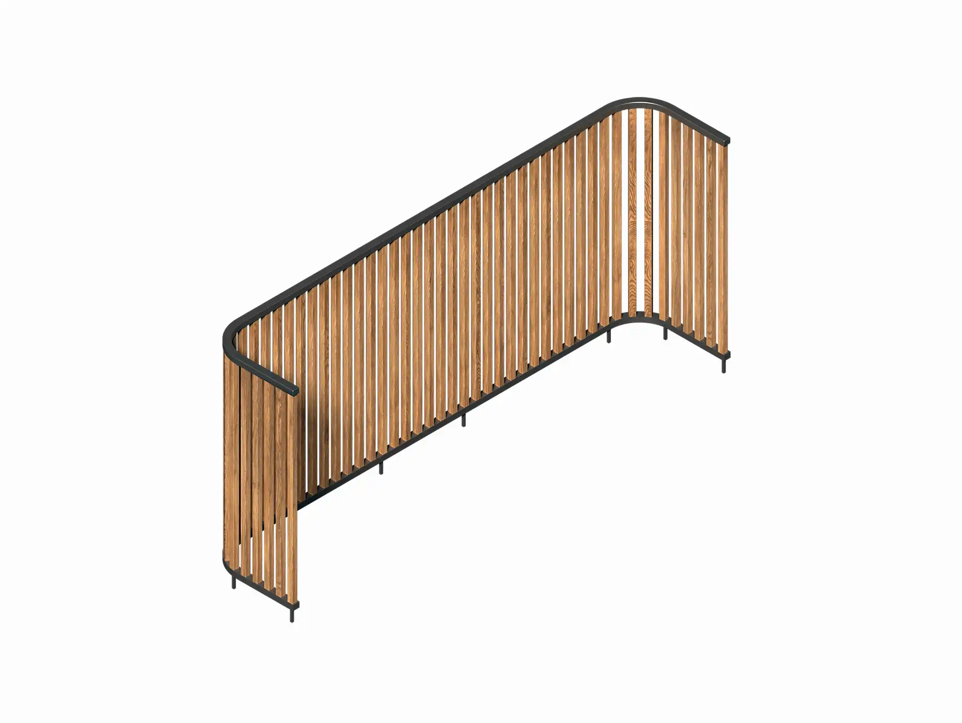 Дополнительный элемент, монтируется к скамье 0406. Создаёт ощущение защищённости, визуально завершает композицию и может использоваться как зонирующий модуль. Выполнен в виде вертикальных ламелей с мягким изгибом в плане.
