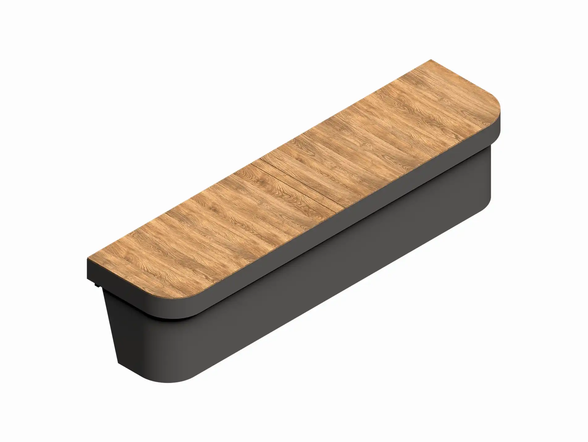Прямолинейная скамья-платформа с лаконичной посадочной частью. Может использоваться как элемент модульной композиции вместе со спинками для создания уединенных зон, посадочных линий и хорошо вписывается зеленую среду.