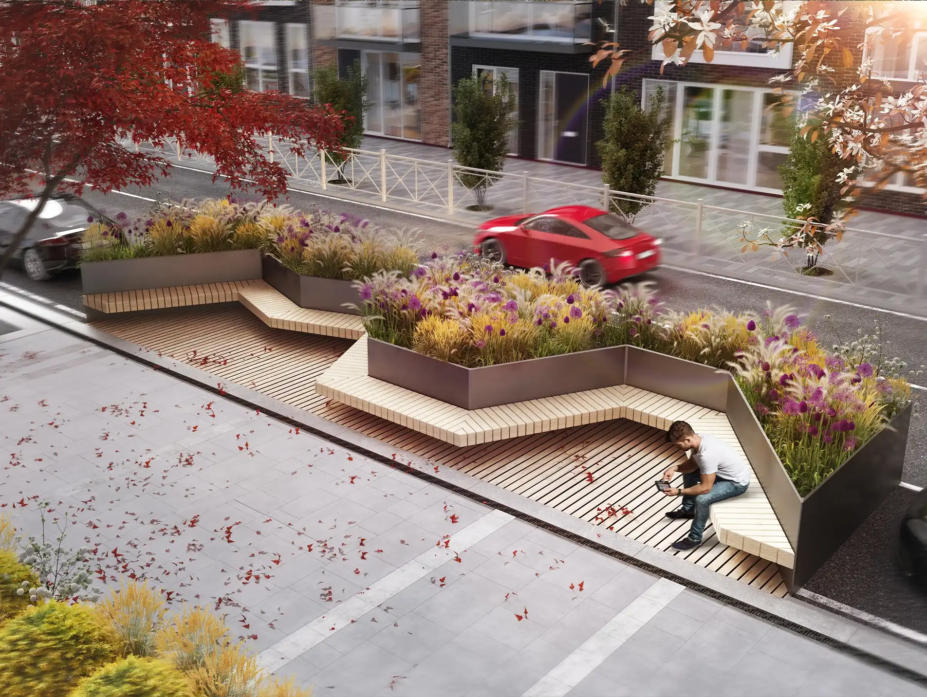Парклет со смещенными сиденьями, разворачивающими посадку в разные стороны. В основе — принцип визуального расслоения пространства: человек ощущает уединение даже в плотной среде. Элемент дополнен зелеными вставками, усиливающими эффект разделения.