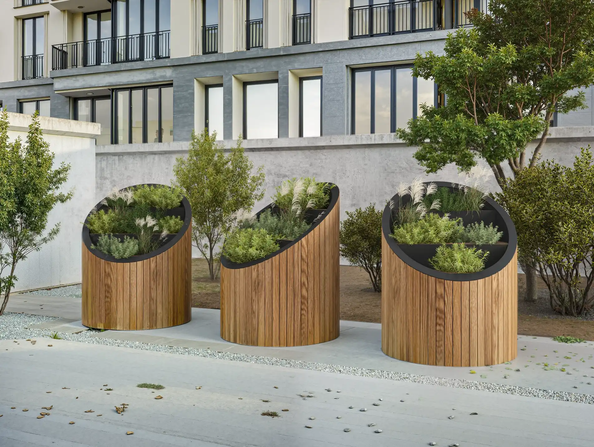 Кашпо округлой формы, выполненное из дерева. Предназначено для размещения растений в общественных пространствах. Деревянная конструкция придает изделию натуральный вид, способствуя созданию уютной атмосферы.