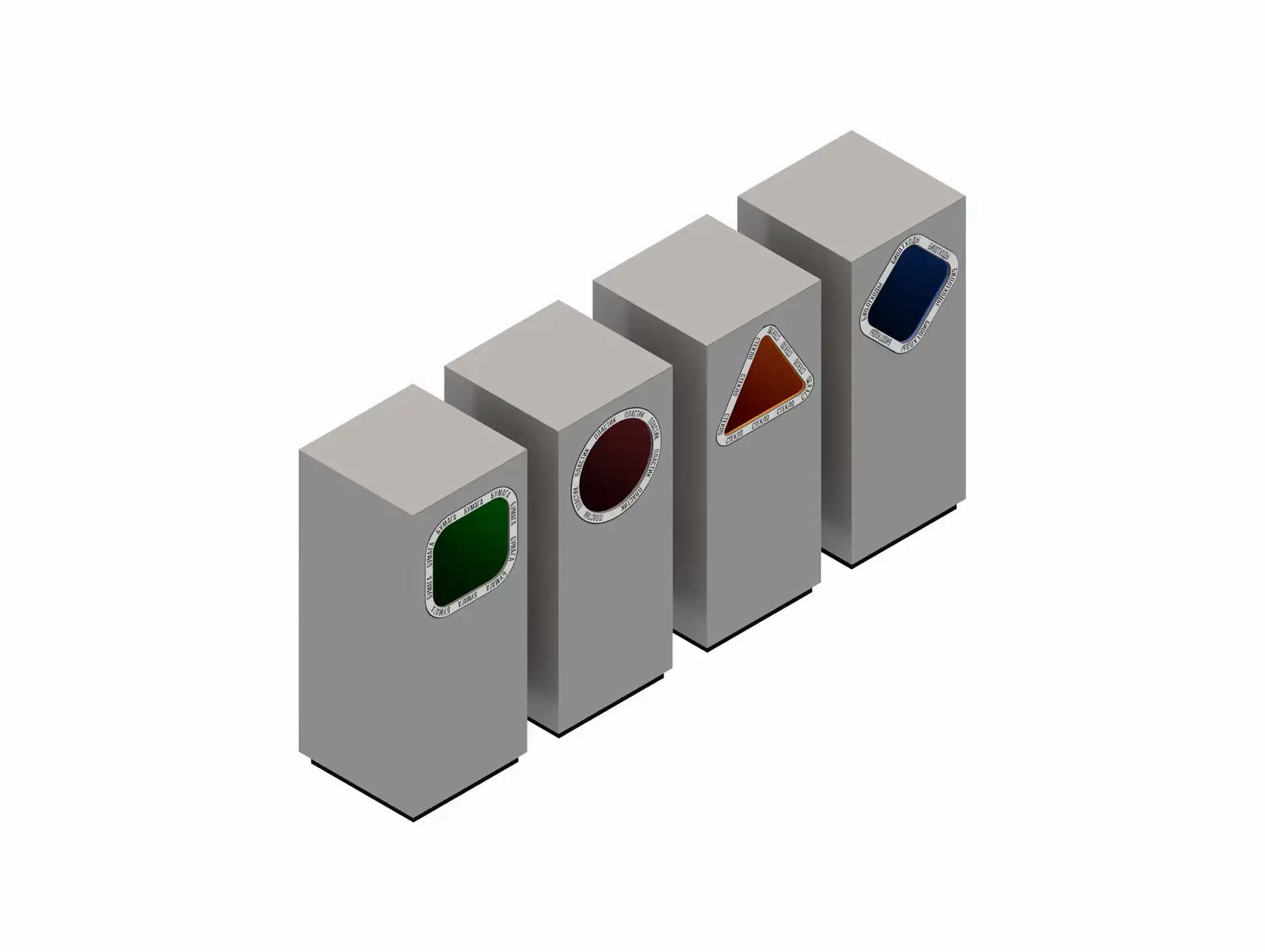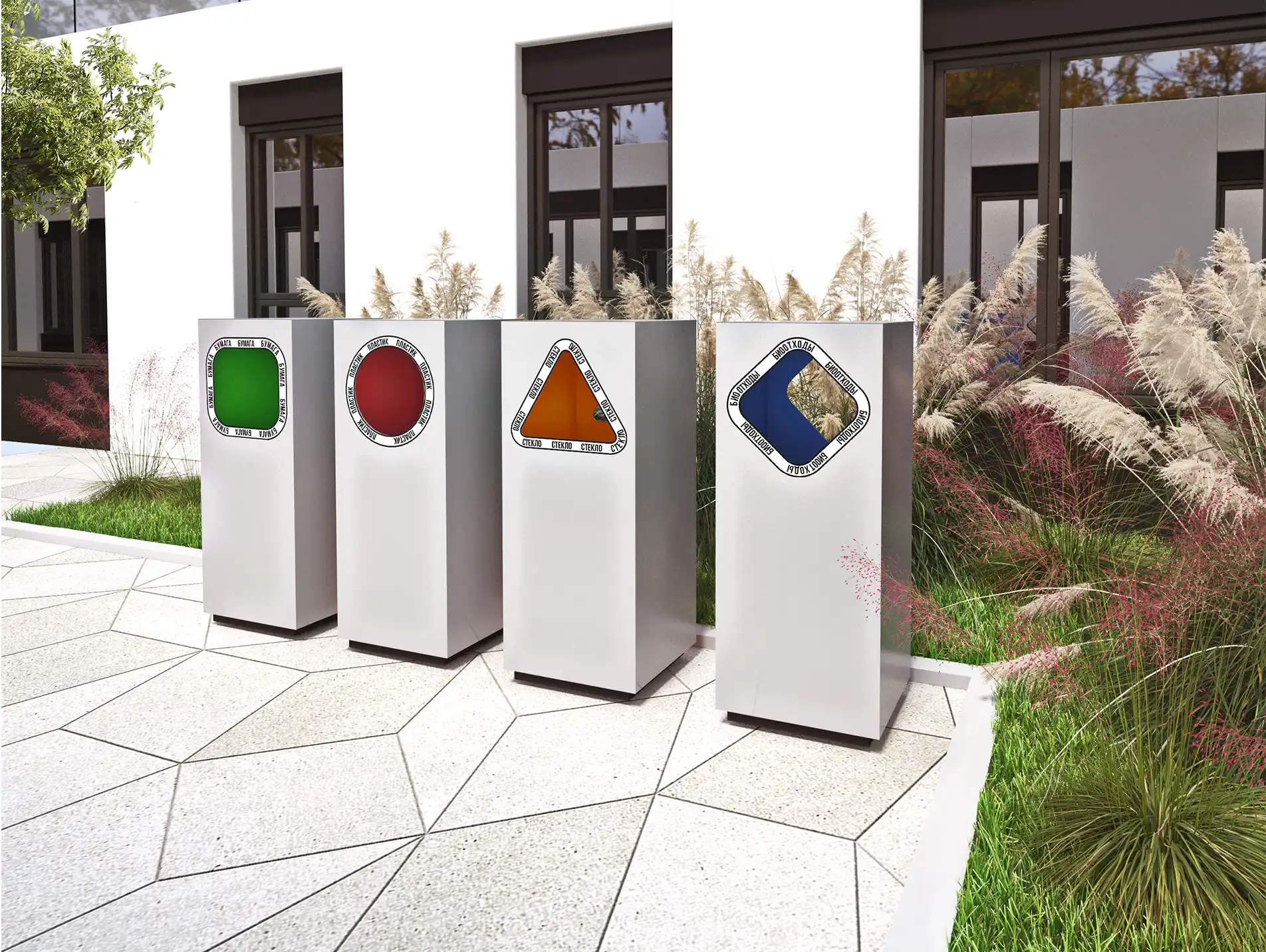 Металлическая урна с цельным корпусом и верхней крышкой с оригинальными отверстиями для выброса мусора. Благодаря лаконичной форме и характерной верхней геометрии выглядит строго, но современно и не перегружает визуальную среду.