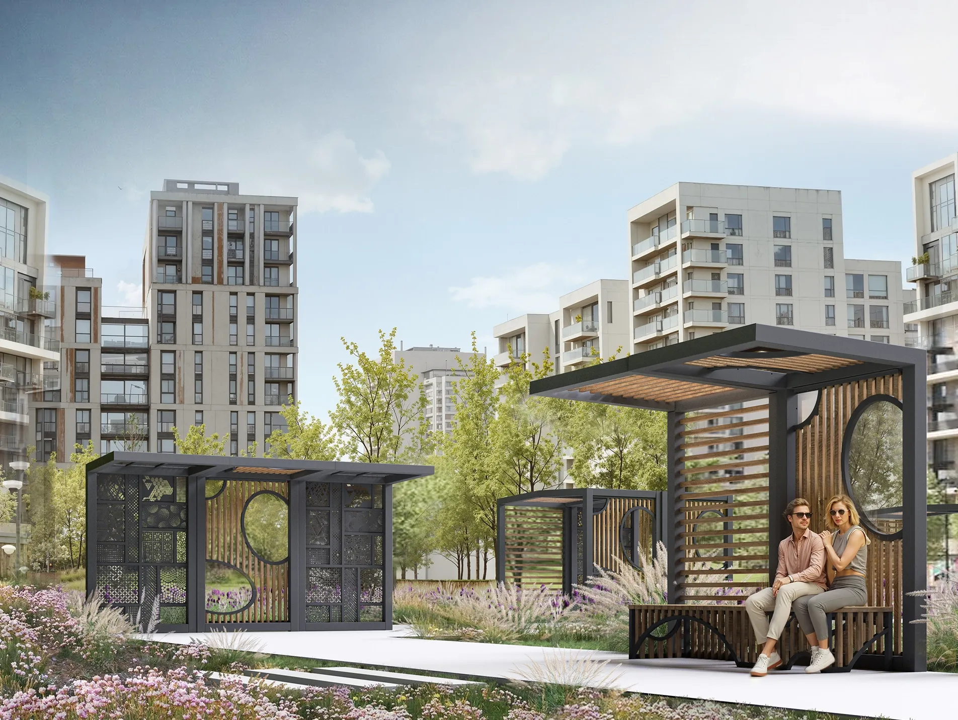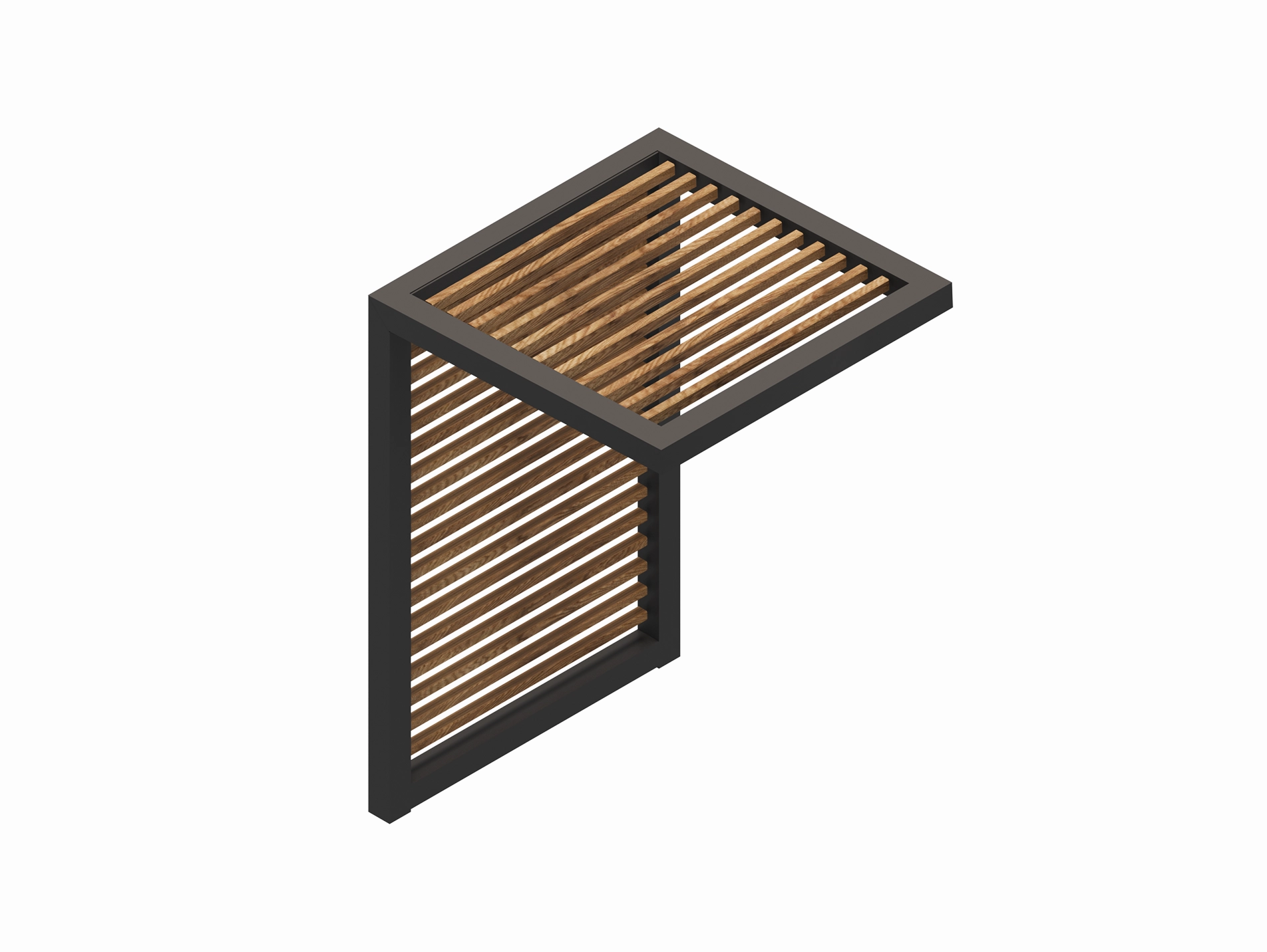 Навес аналогичного размера и конструкции, но с более сдержанным дизайном. Отличается минималистичной эстетикой. В сочетании с 1325 формирует сбалансированную композицию для зонирования пространства или создания мест отдыха.