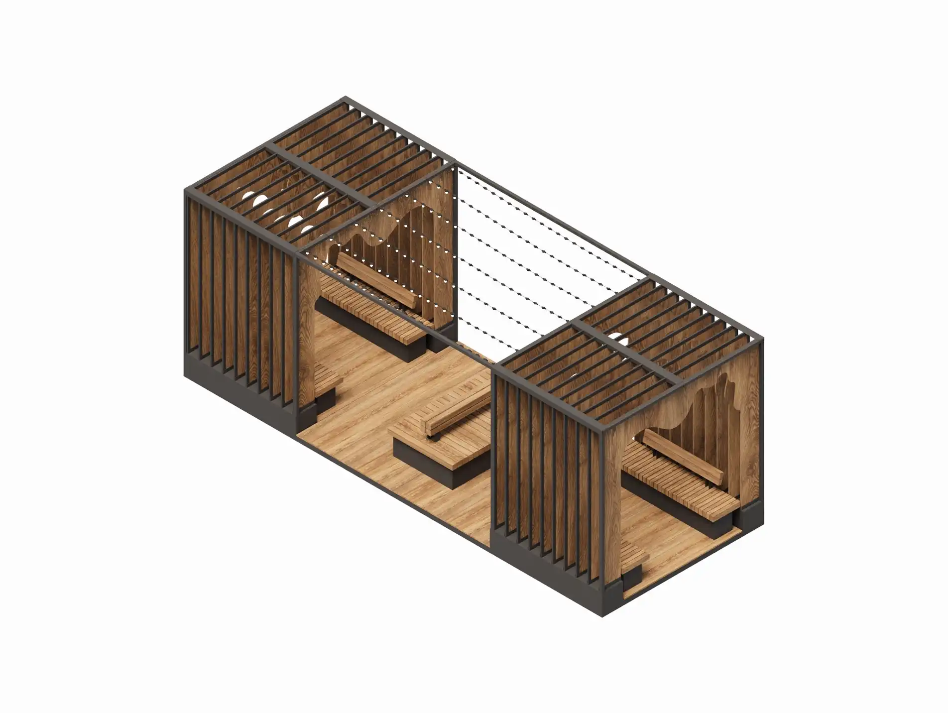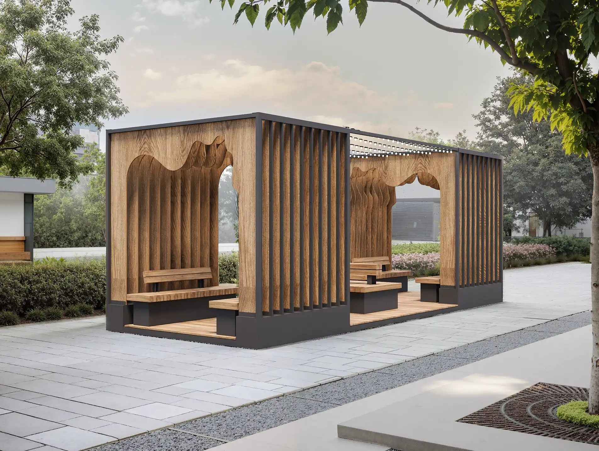 Парклет с ритмичными вертикальными ламелями, световыми гирляндами и выразительным силуэтом входной арки. Встроенные скамьи и столики позволяют использовать пространство для коллективного досуга. Воздух, полутень, тактильность дерева и текстиля формируют комфортную атмосферу.