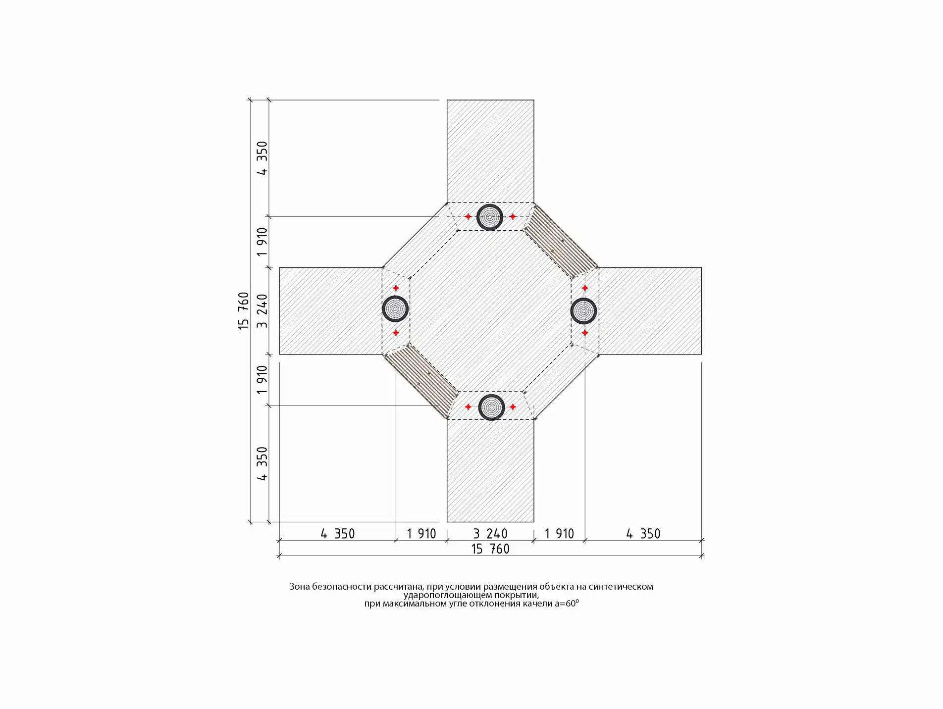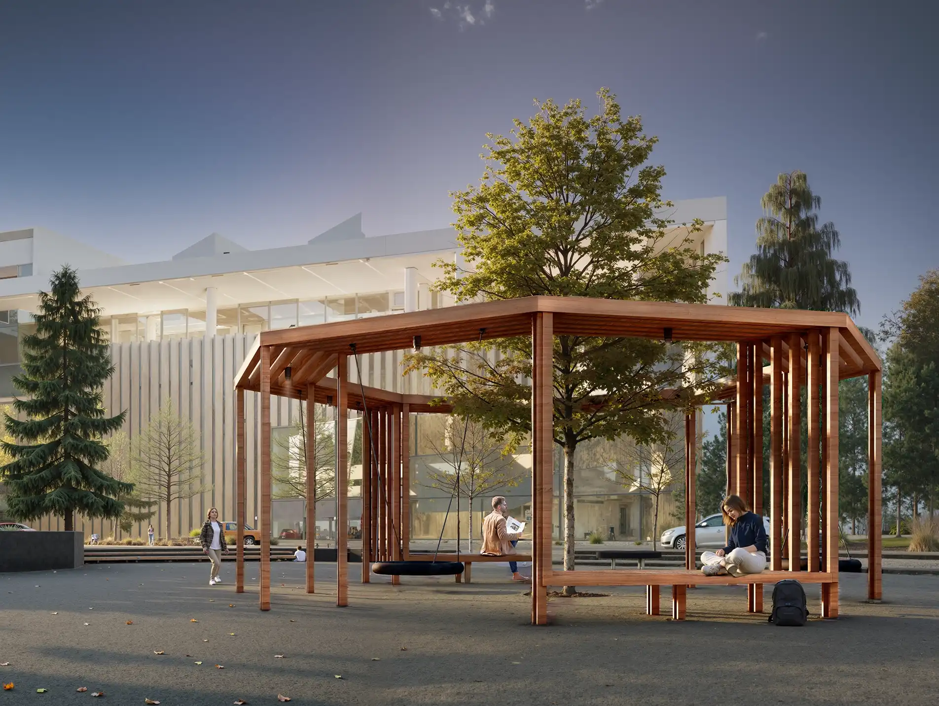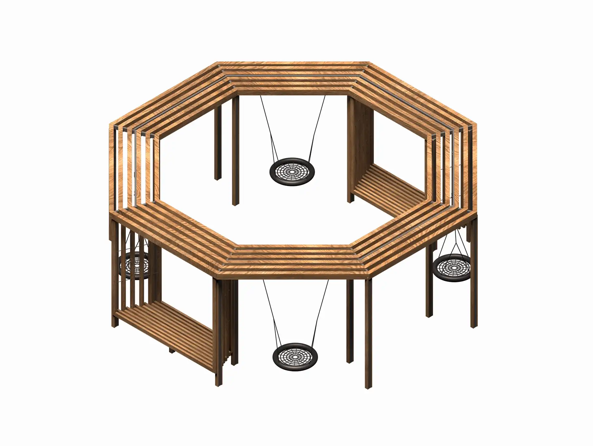 Масштабная навесная конструкция с деревянной посадкой и подвесными качелями. Архитектурный образ навеса основан на сочетании открытости и выразительных горизонталей. Работает как пространственная доминанта.