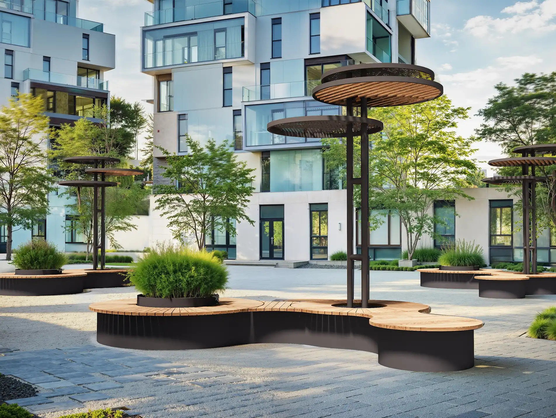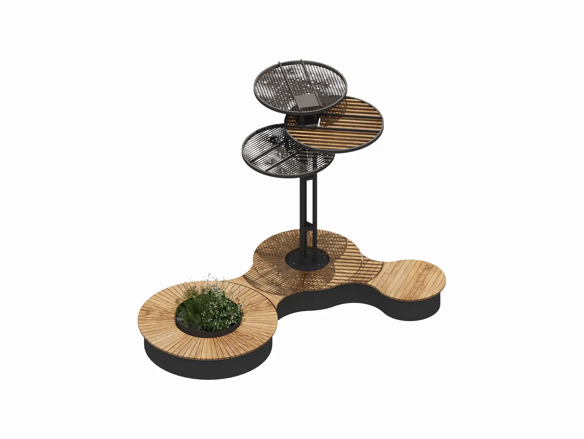 Необычная скамья-платформа с выразительным навесом, конструктивно напоминающая экзотическое растение. Вертикальная металлическая структура и перфорированные круги создают на поверхности световые узоры и формируют ритмичный экран. Конструкция станет пространственной доминантой и одновременно — полноценной зоной отдыха.