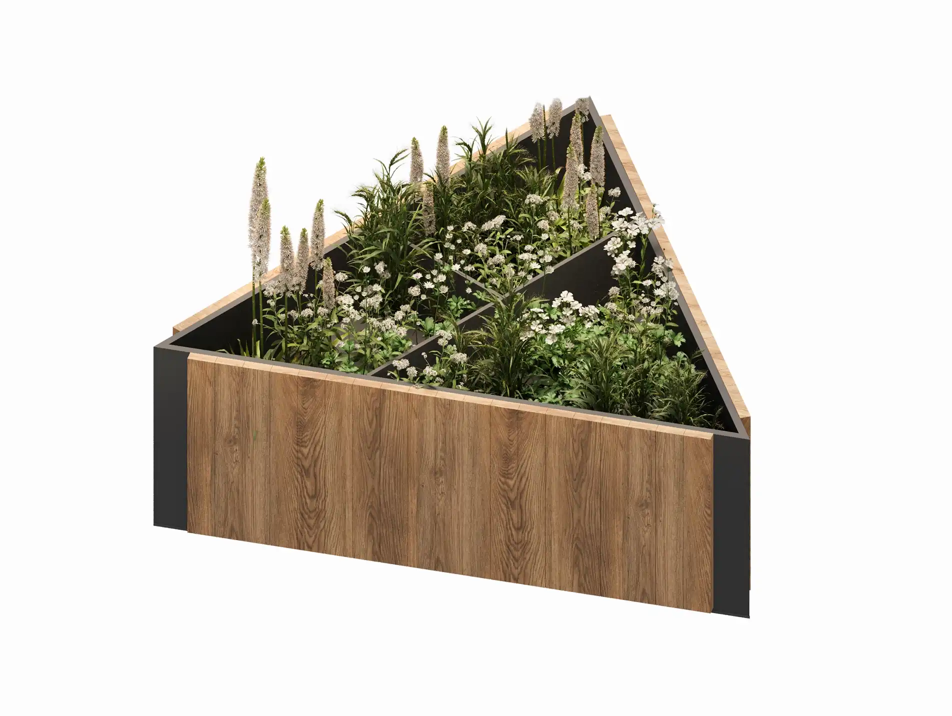 Треугольное кашпо с выразительной геометрией и деревянной вертикальной обшивкой. Модульная форма позволяет использовать элемент в одиночку или собирать в группы для создания зелёных фрагментов в общественном пространстве.