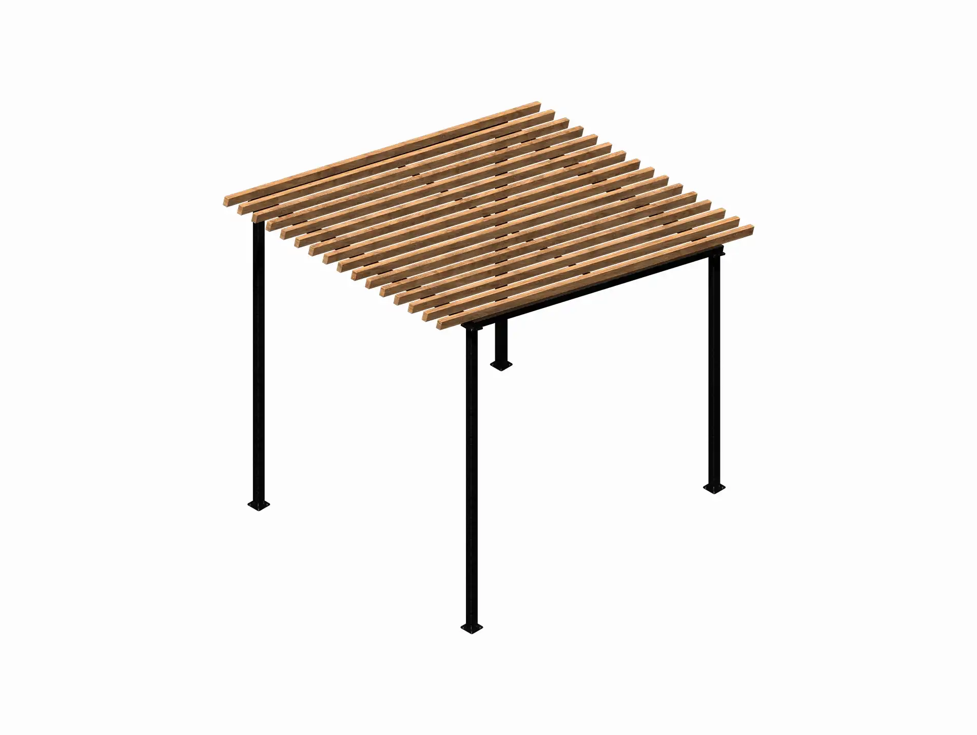 Модуль из серии «Конструктор», навес на металлических опорах. Конструкция легко интегрируется в более крупные композиции с другими модулями, позволяя формировать уникальные сборки — от уединенных точек до протяженных зон. Визуально легкий и пластичный, работает в разных сценариях.