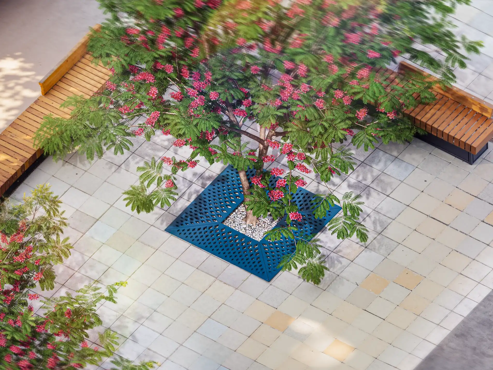 Геометричный орнамент с прямым ритмом подчеркивает композицию посадки и защищает приствольное пространство от вытаптывания. Используется с деревьями в мощении.