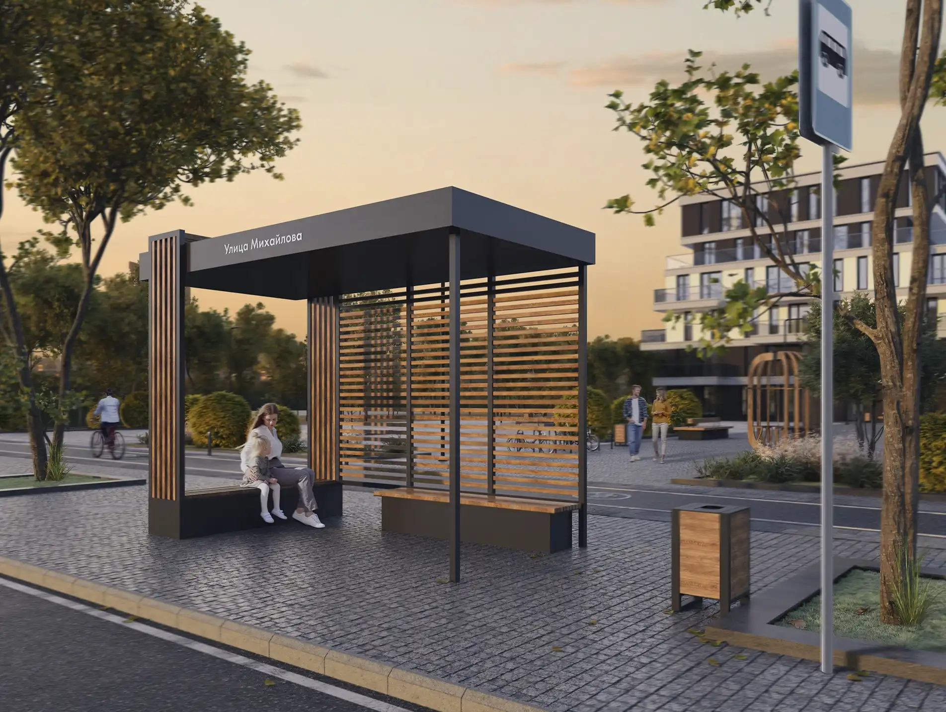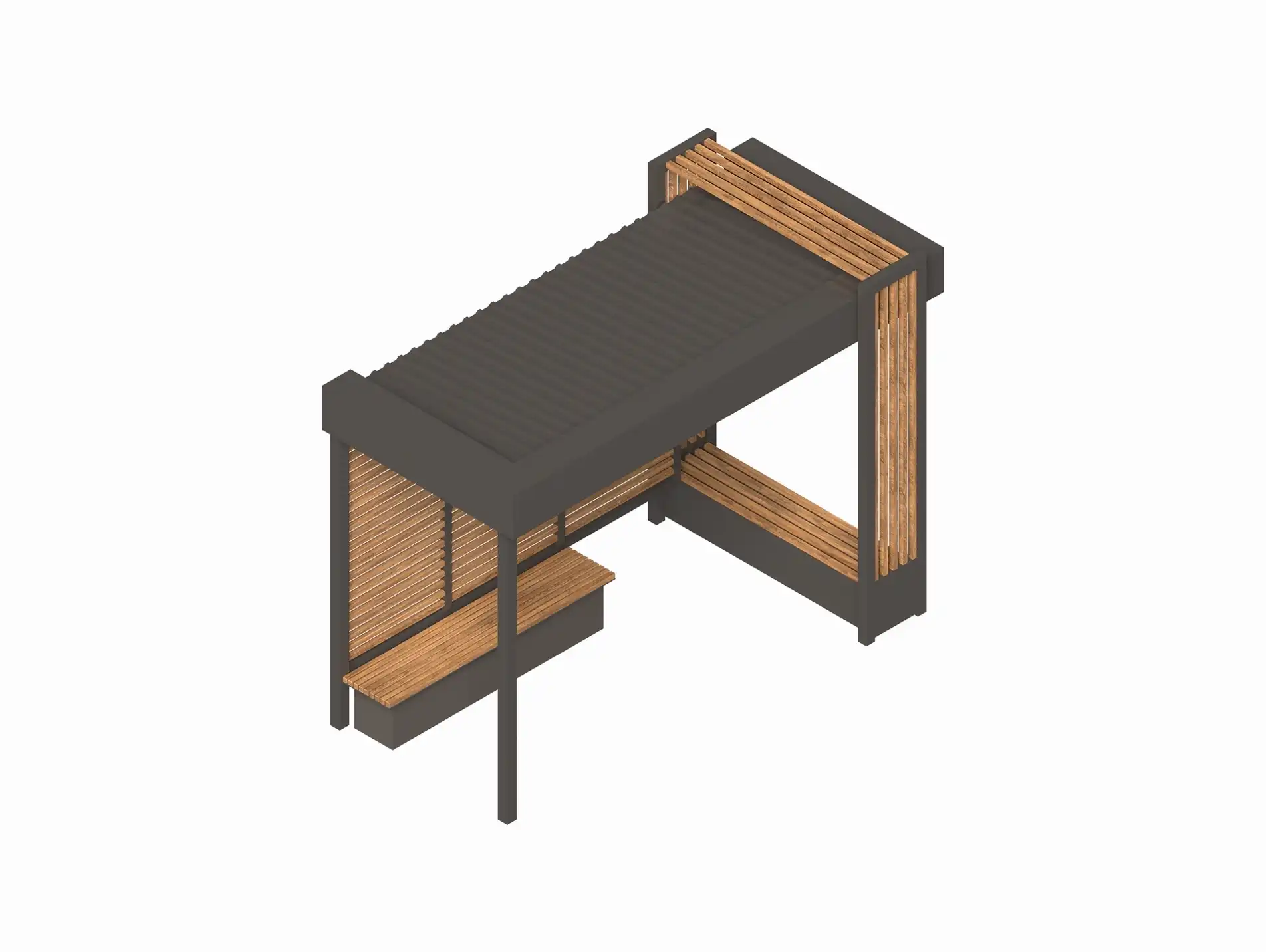 Функциональный крытый павильон с боковой панелью и сиденьями. Подходит для жилых кварталов, деловых районов и маршрутов с интенсивным трафиком. Обеспечивает защиту и поддерживает аккуратный городской контур.