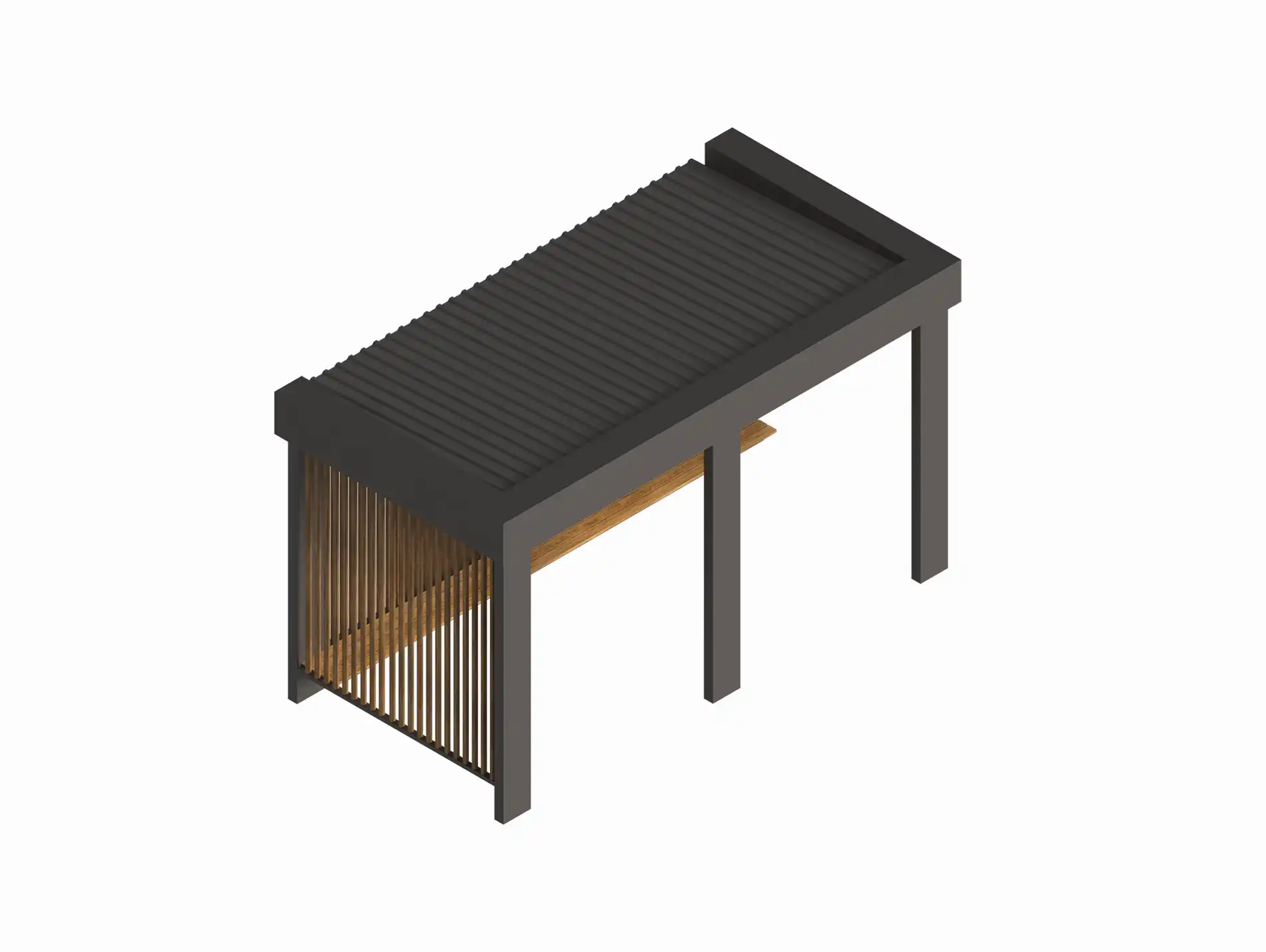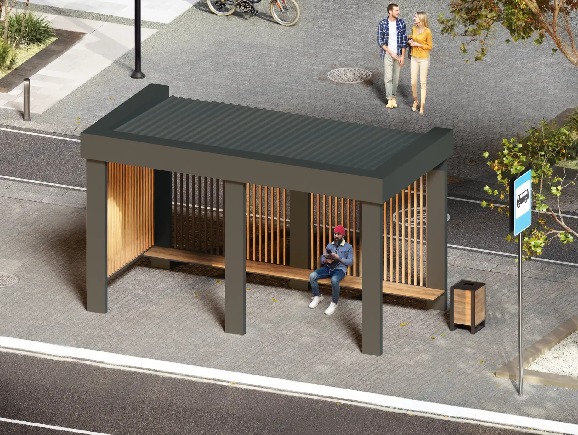 Вариант остановочного павильона 3368 с отличиями в деталях конструкции. Металлическое основание и элементы из дерева сочетают практичность и визуальную выразительность. Объект можно дополнить велопарковкой, урной или другим элементом благоустройства. Решение, адаптированное под разные типы городских пространств.