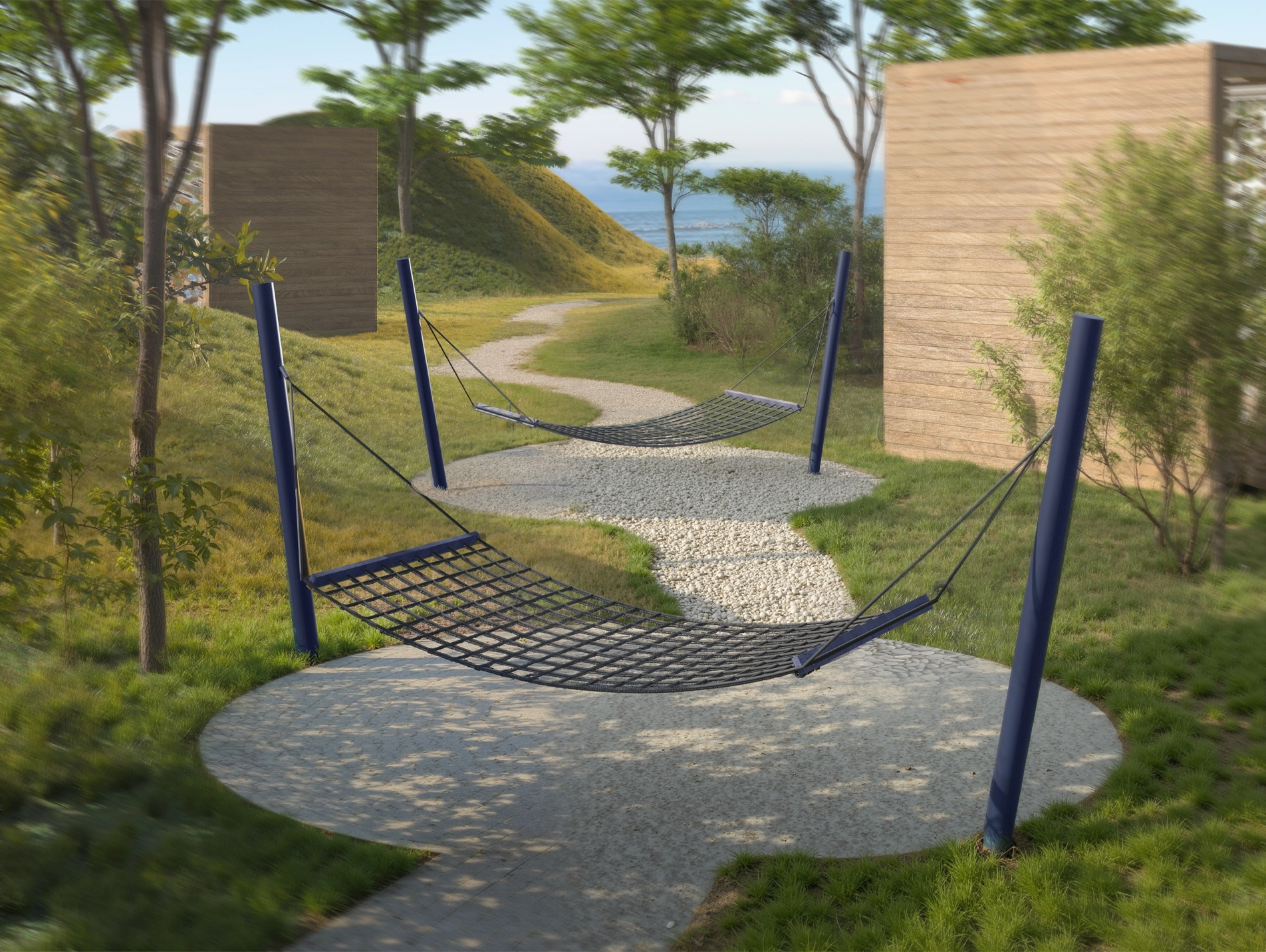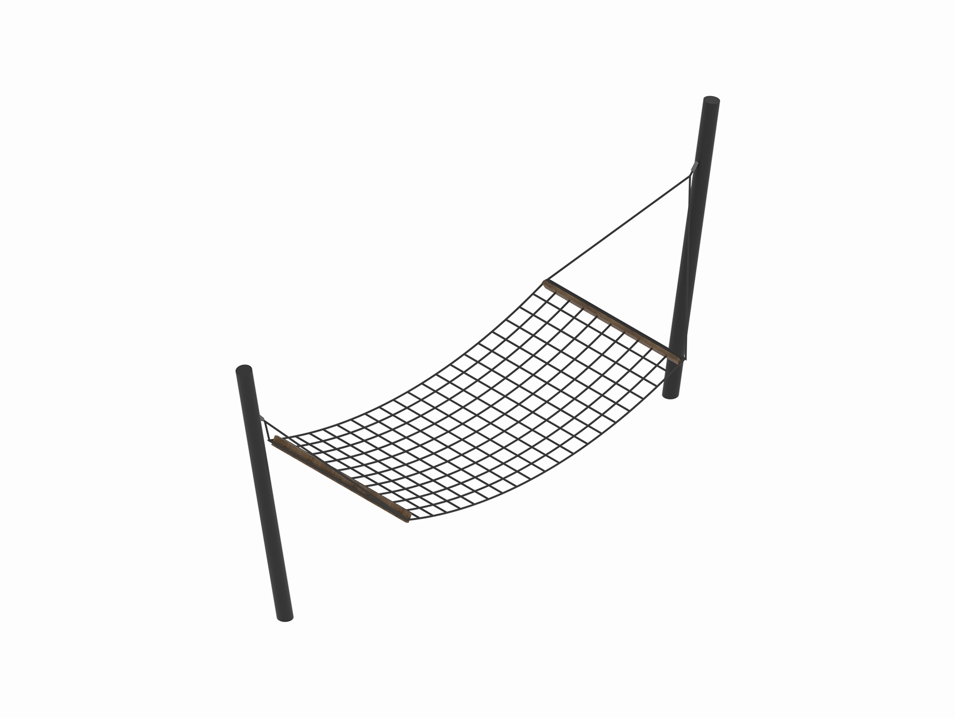 Гибкая конструкция в форме гамака — удобный элемент городской среды, способствующий расслаблению и взаимодействию с пространством. Прочная сетка фиксируется между двумя стойками, создавая упругую зону для отдыха.