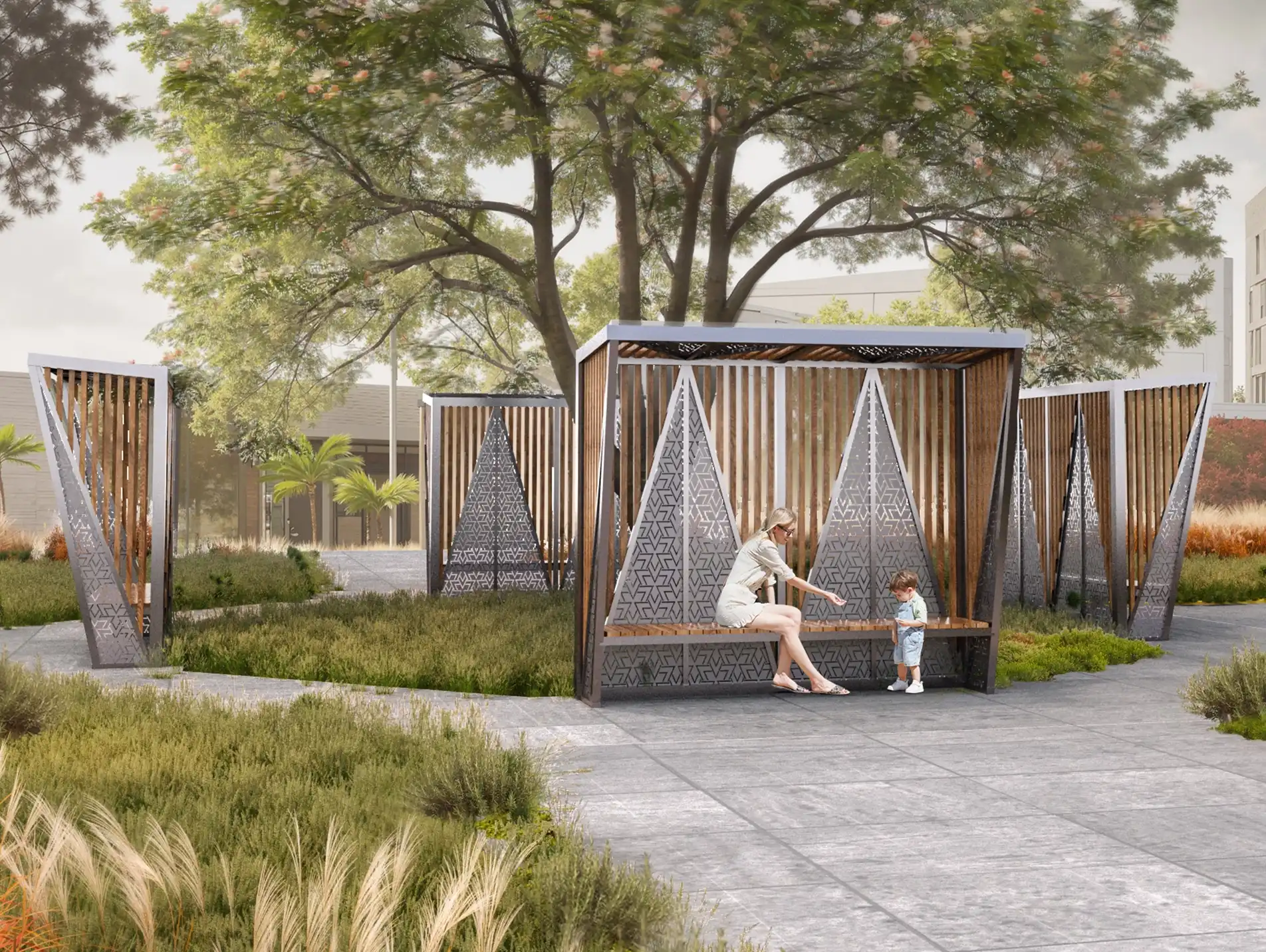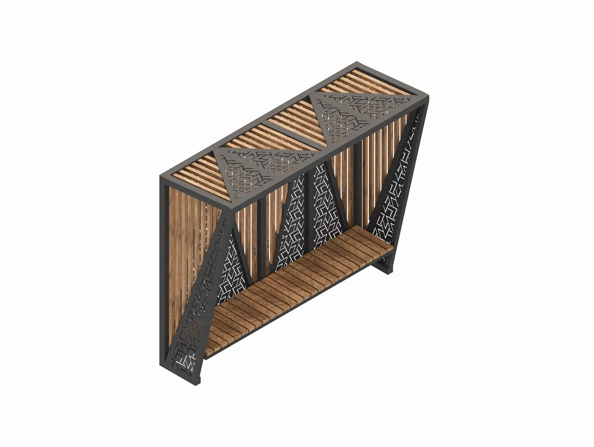 Лаконичная беседка из дерева и металла с художественной перфорацией. Работает как уютная точка отдыха и аккуратный архитектурный акцент в более консервативных проектах. Уместна в дворах, на маршрутах, у входных групп.