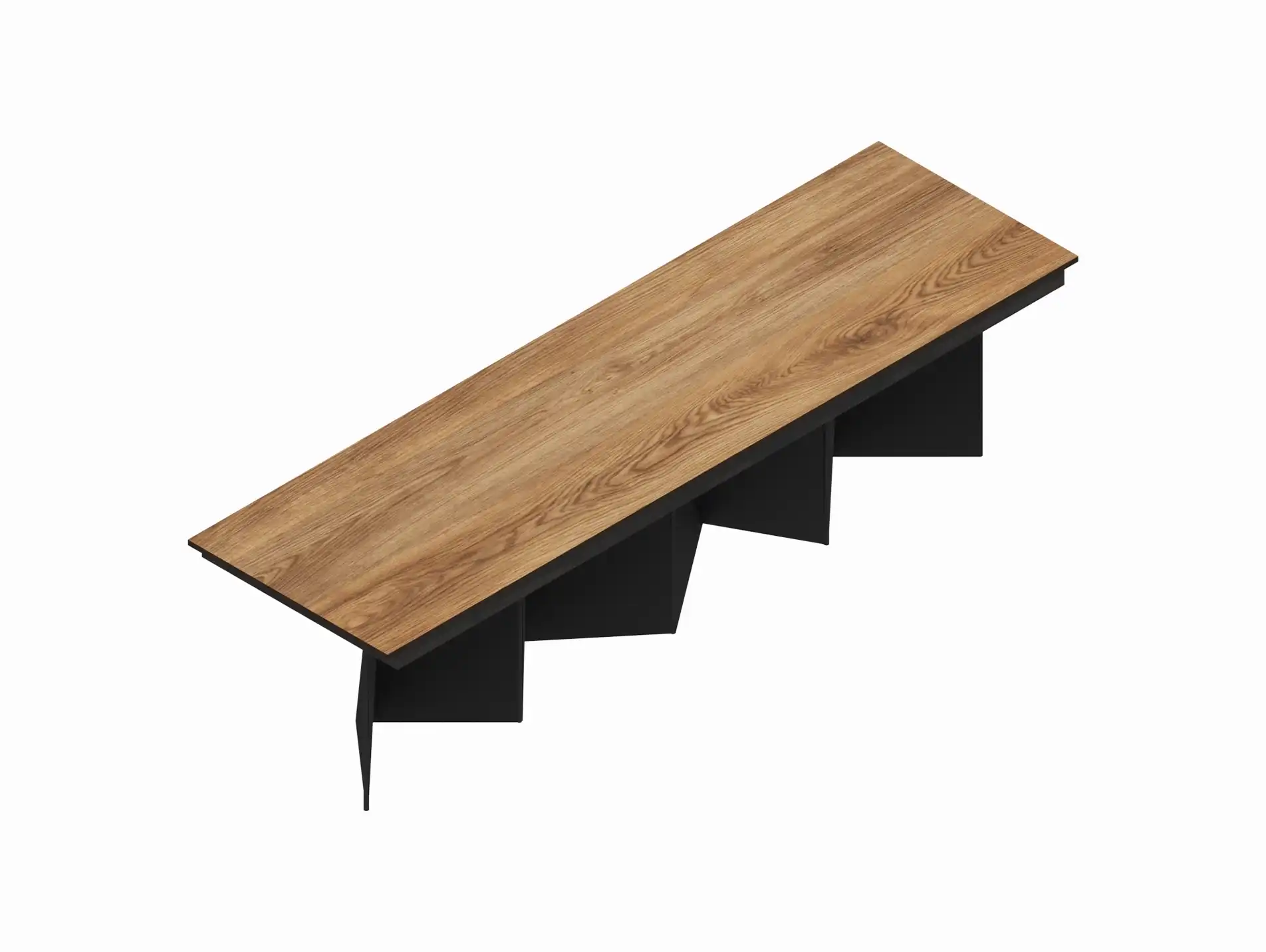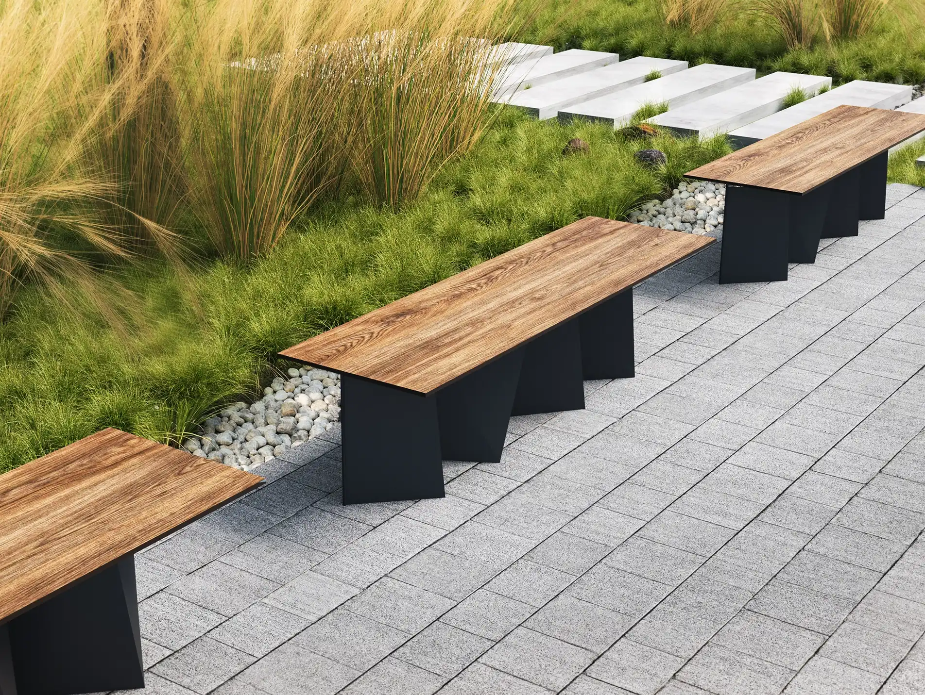 Скамья с зигзагообразным основанием и лаконичным сиденьем. Минимализм с характером: работает как строгий, но выразительный акцент. Подходит для деловых кварталов и строгих общественных пространств.
