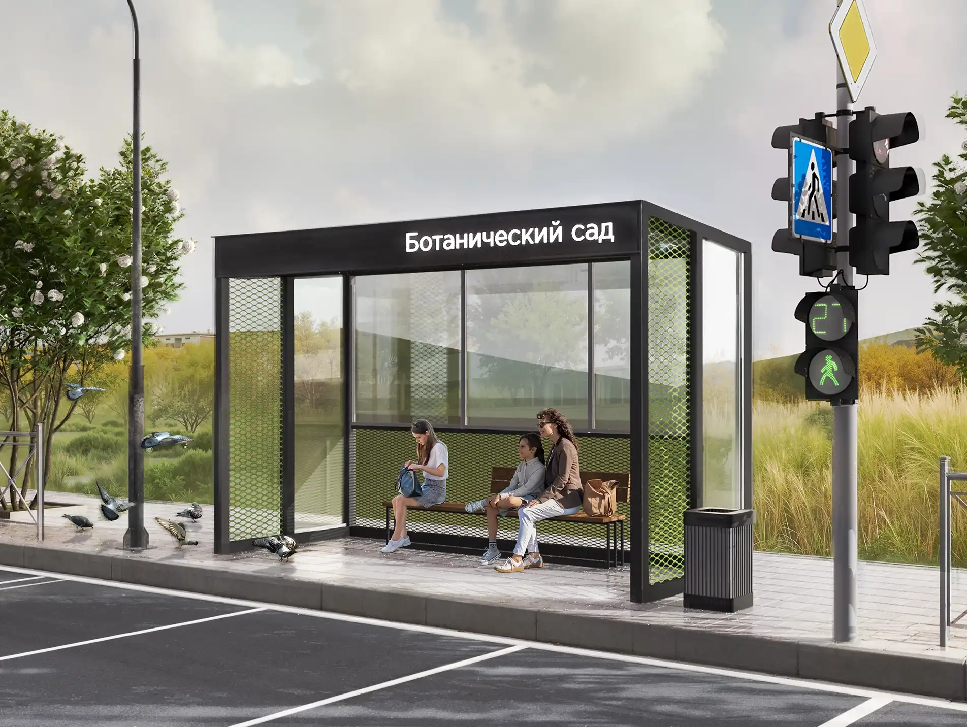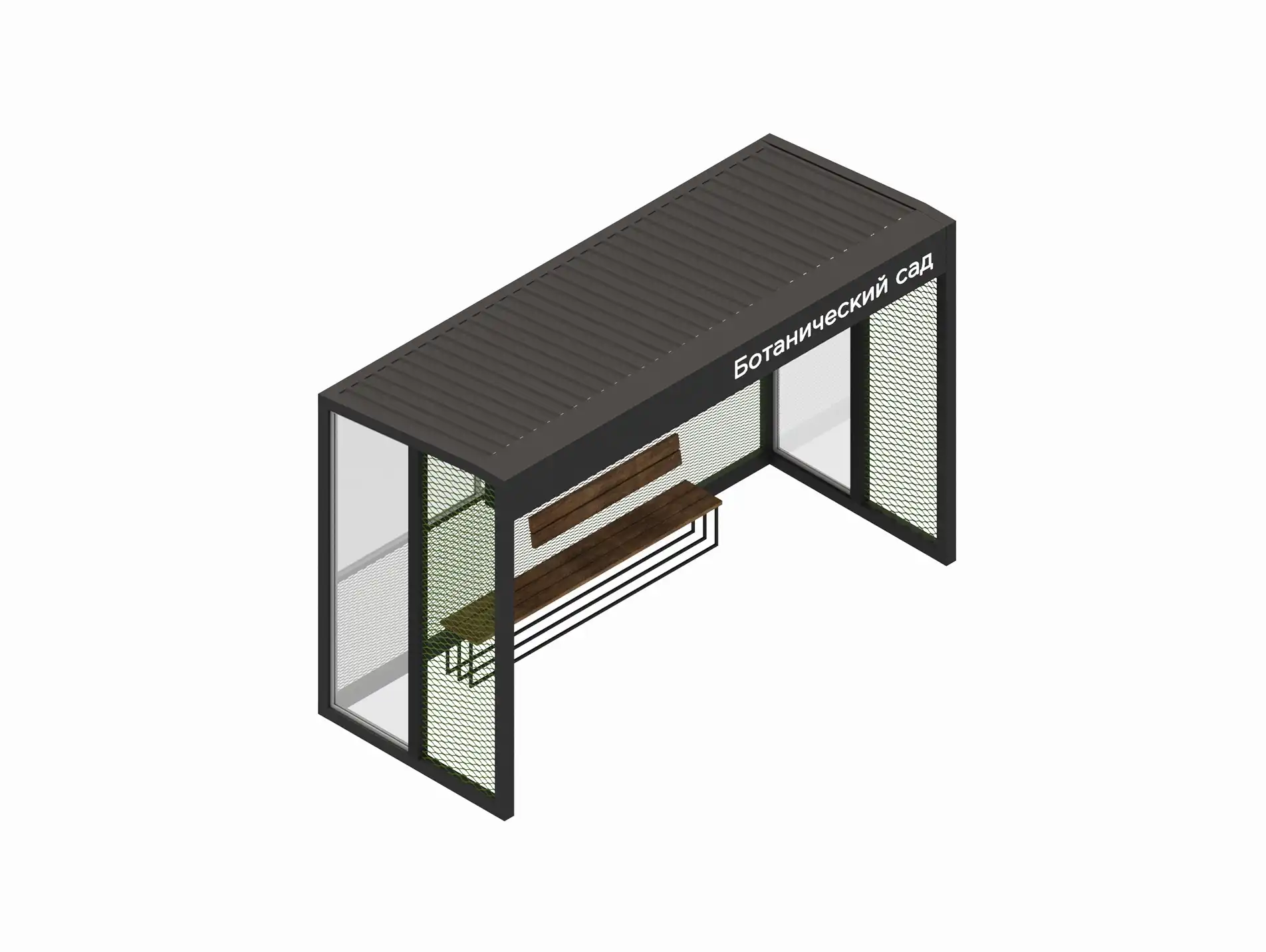 Остановка с перфорированными панелями, навесом и встроенной подсветкой. Поддерживает визуальную ритмику городской среды, подходит для проектов, где важна лёгкость и технологичный акцент.