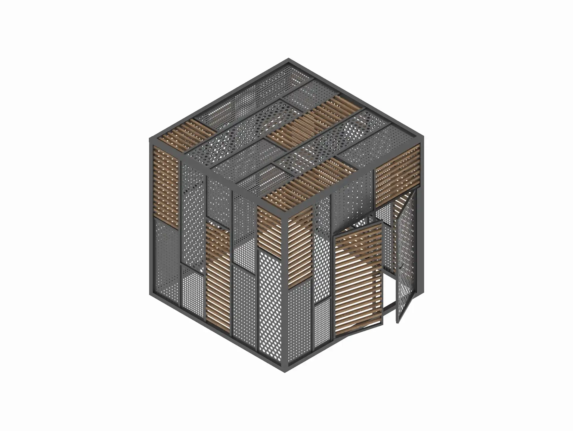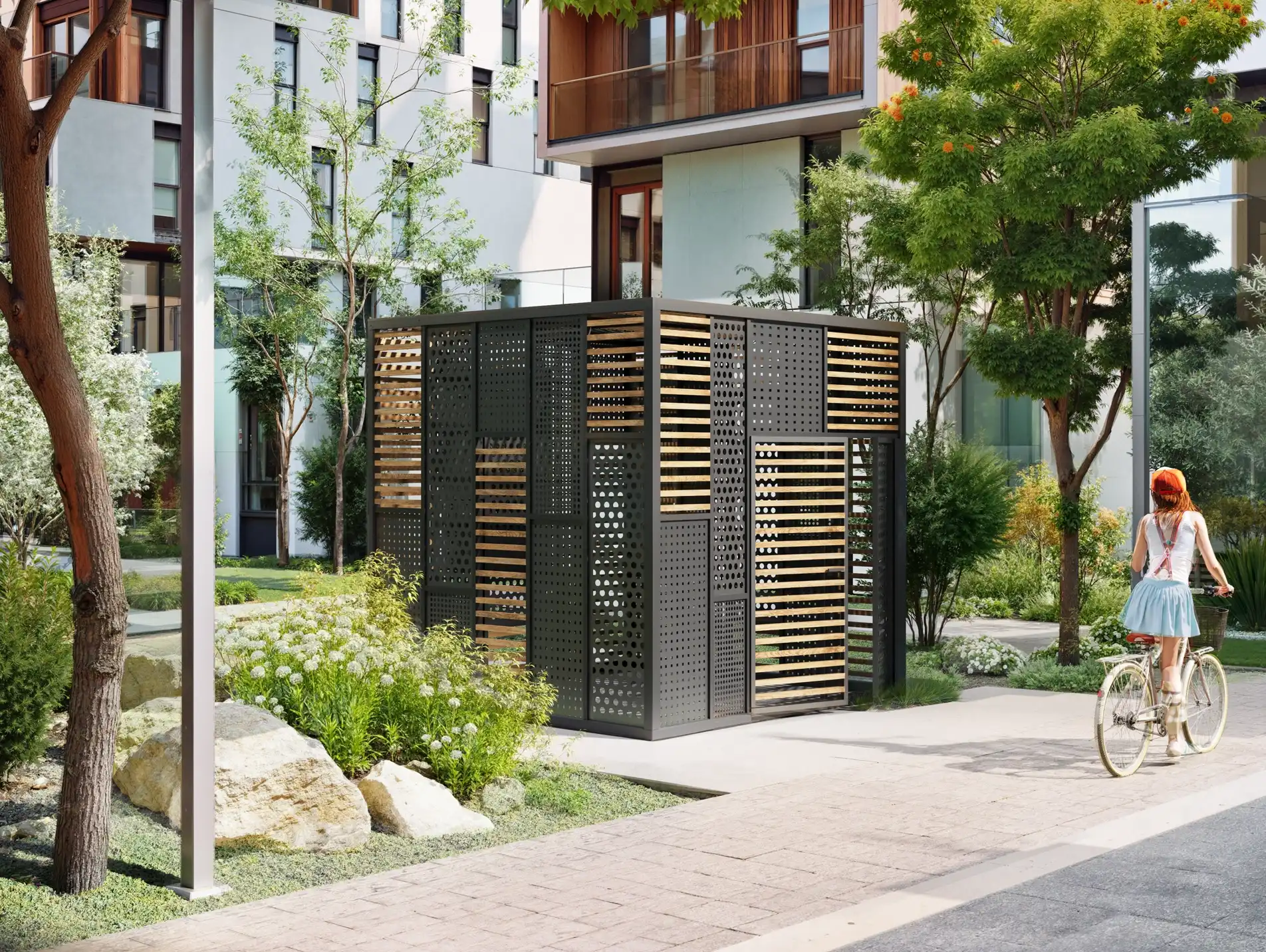 Модуль с лаконичной архитектурой и симметрией. Защищает контейнеры от осадков, вписывается в жилые и общественные пространства. Используется в проектах, где важно скрыть сервисную зону.