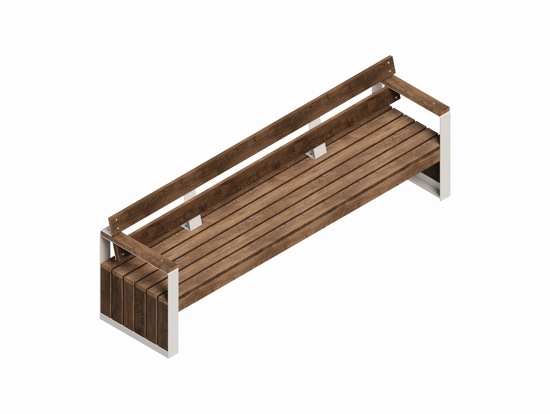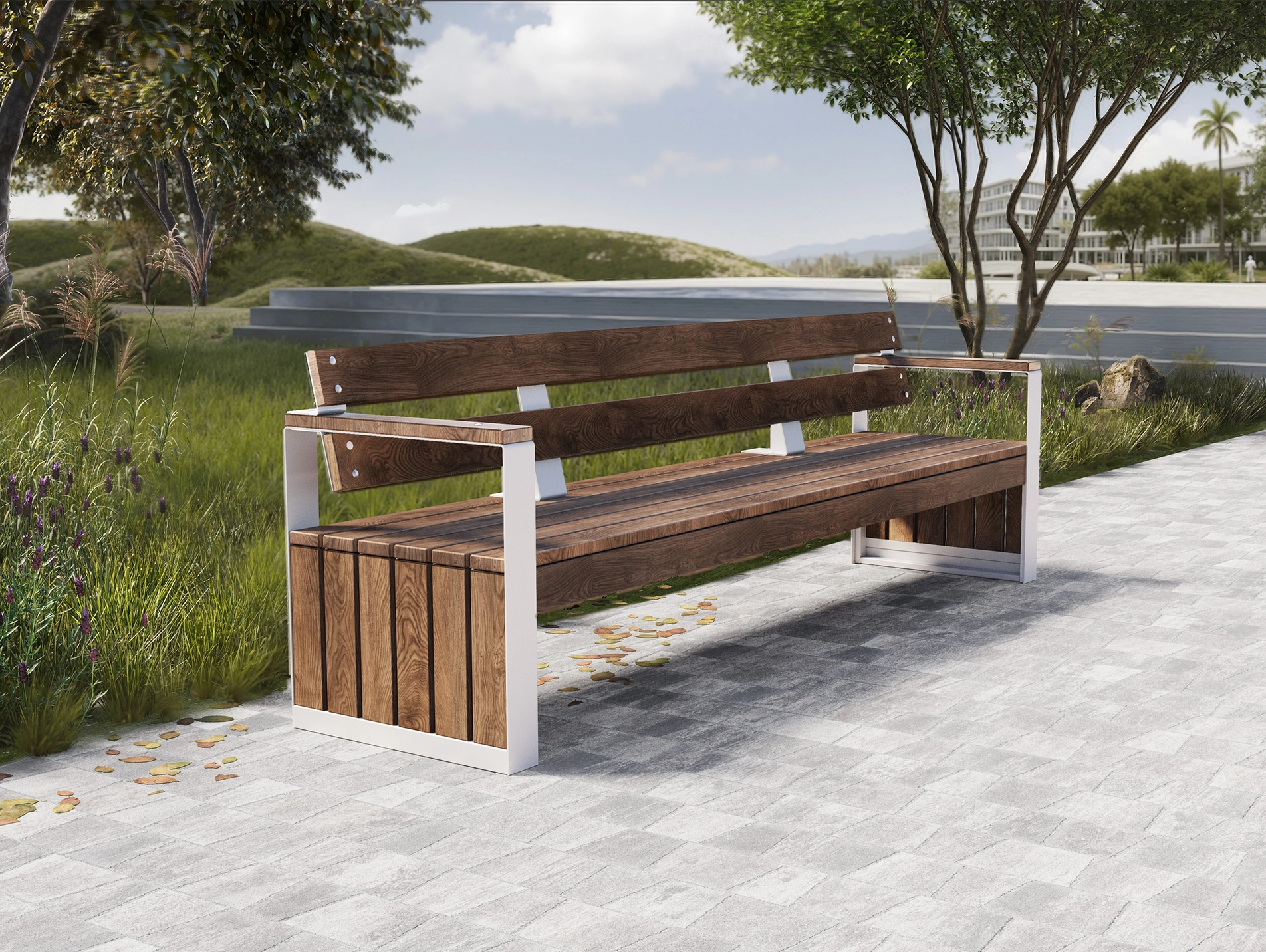 Вариация скамьи 6300 с чистой горизонталью и собранными торцами-объемами. Деревянная посадочная плоскость добавляет тепла и тактильности, металлический каркас держит графику. Модель аккуратно выстраивает ритм и задает спокойную паузу в движении.