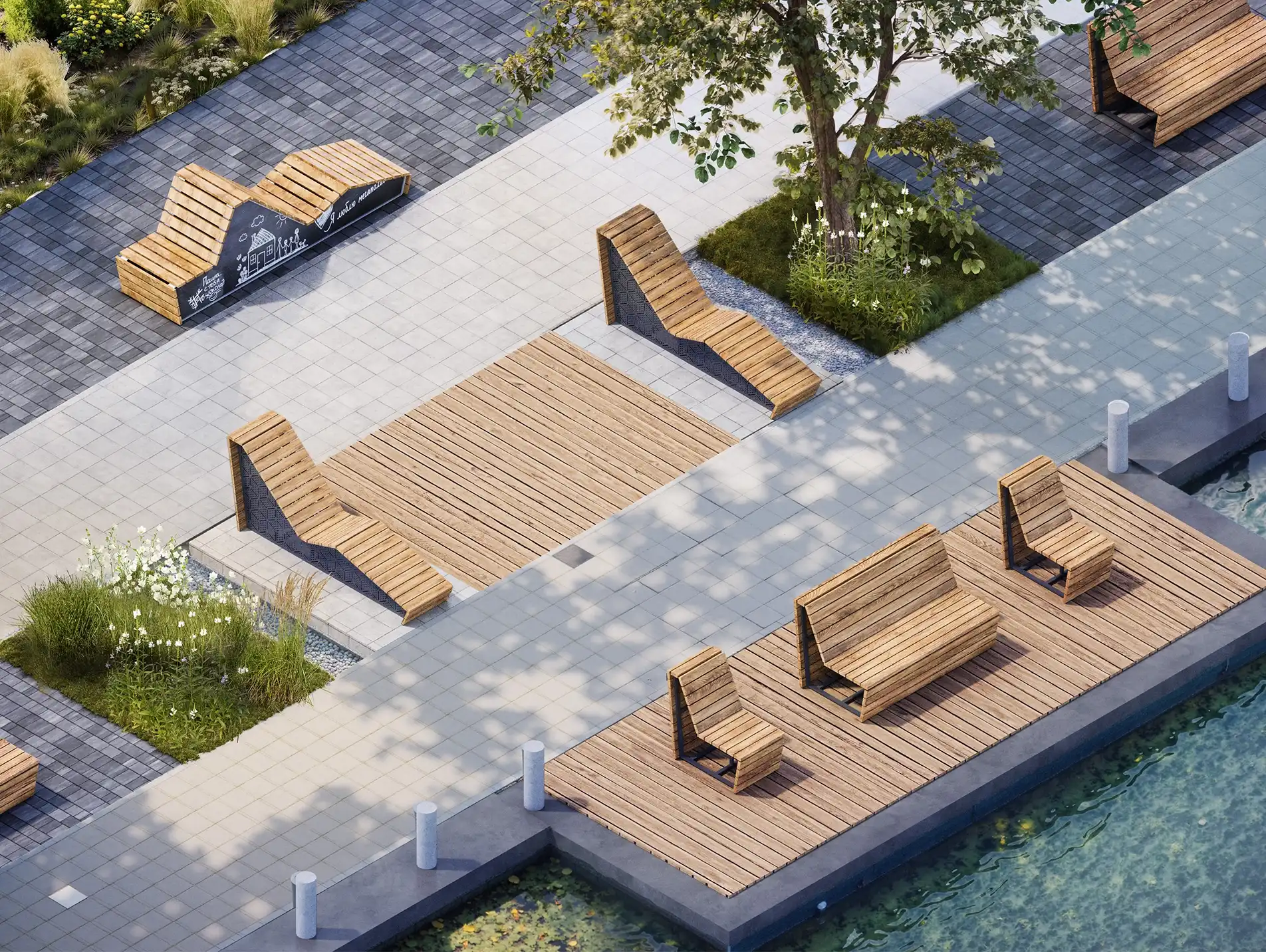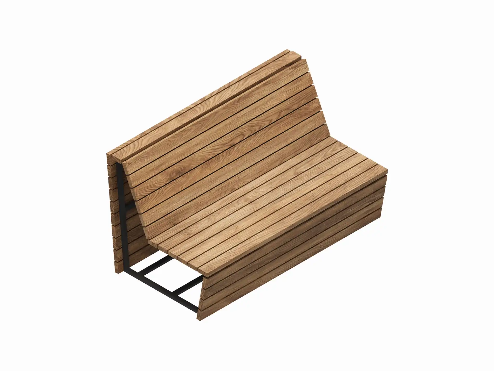 Двухместная скамья с анатомичной спинкой и глубоким сиденьем. Создаёт комфортную полуоткрытую посадку для отдыха. Визуально работает как акцентный блок, но легко включается в модульные схемы. Может устанавливаться одиночно или в паре с другими элементами — скамьями и подиумами.