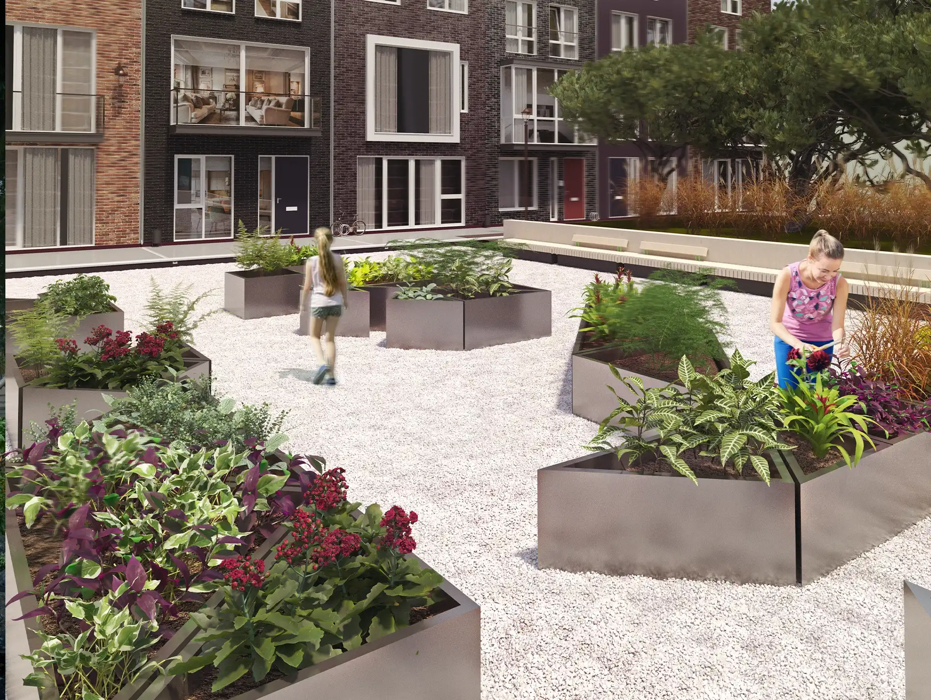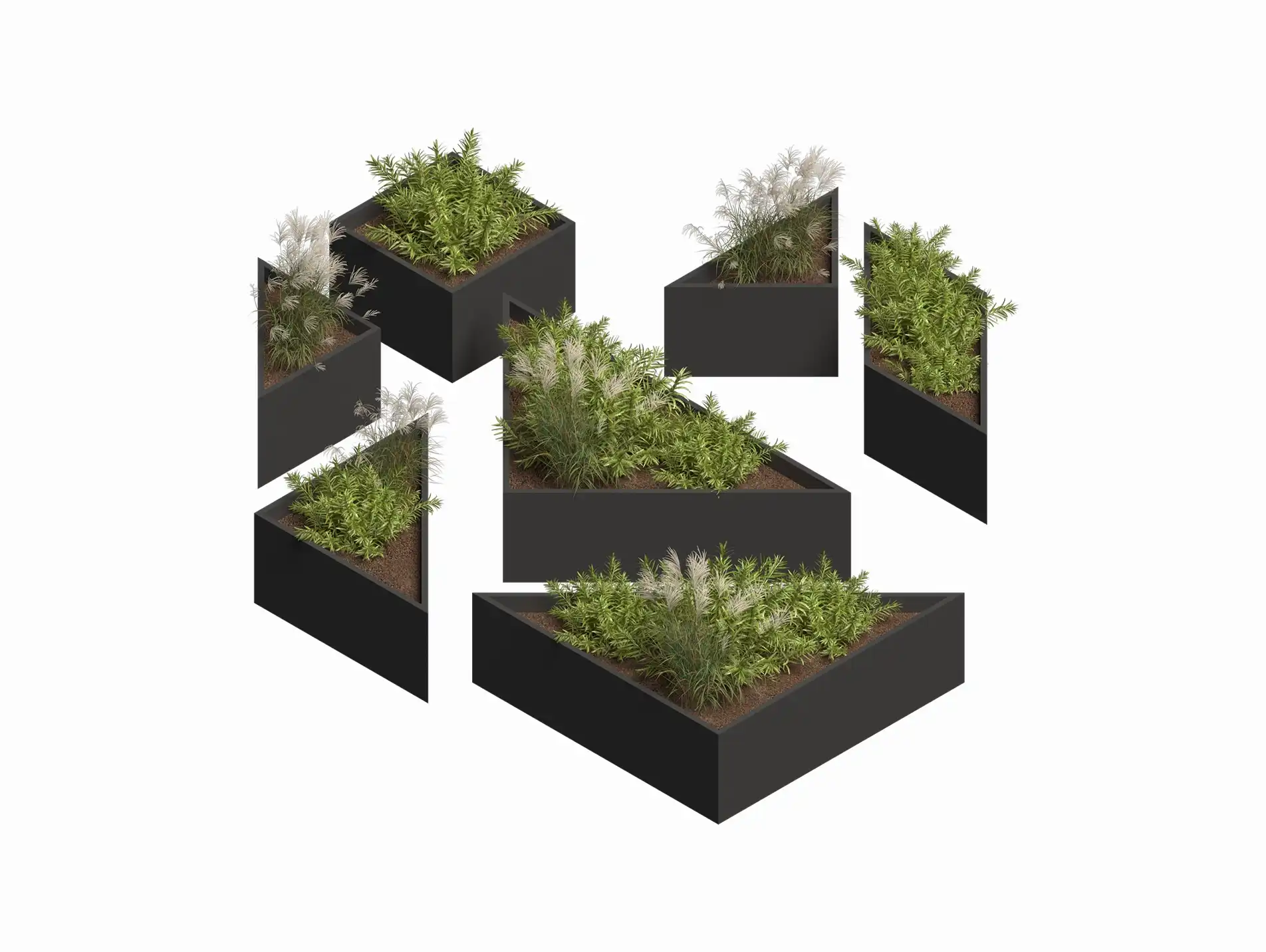Композиционное кашпо-конструктор в форме геометрических элементов, напоминающих фигуры из головоломки Танграм. Эти модули можно складывать в разные формы, создавая сезонные композиции, а объект воспринимается как арт-элемент. Работает как акцентное озеленение, позволяя разнообразить визуальный сценарий площадки.