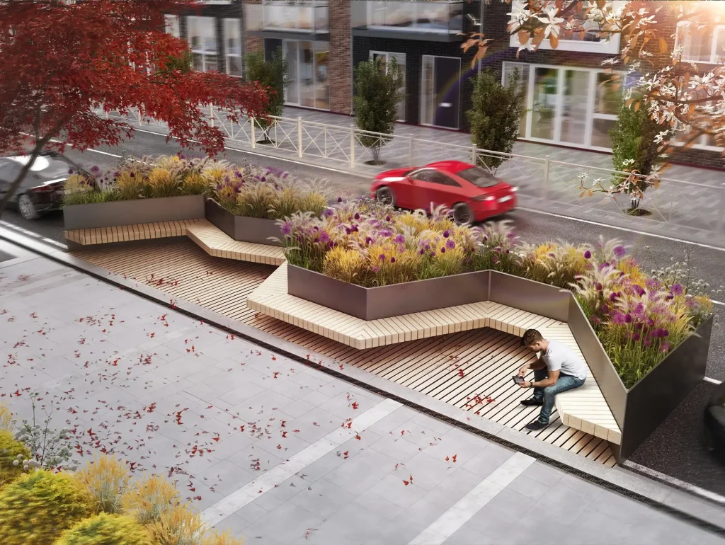 Давно известно о влиянии цвета и формы на настроение человека и то, как он будет воспринимать окружающую его среду. Добавление цвета в элементы городской среды может выгодно выделить пространство, а также сформировать единый стилистический образ локации. Для этой цели хорошо подходят парклеты — комплексные структуры, создающие точки притяжения, замедляющие трафик и озеленяющие пространство.