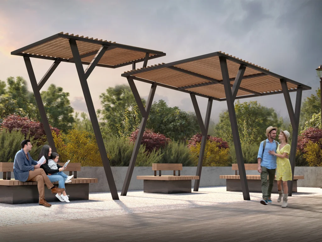 Так, несколько грамотно расположенных скамеек и навесов формируют не просто зону отдыха, а целый «островок спокойствия»: