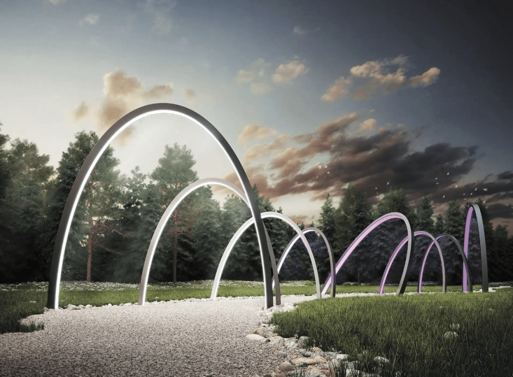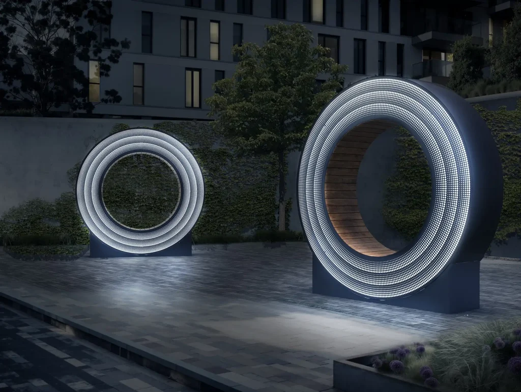 Один из примеров — архитектурная серия арок со встроенной светодиодной подсветкой. Изогнутые линии задают ритм и масштаб пространству, позволяя организовать длинную галерею или аллею. Подсветка подчеркивает силуэт в темное время суток.